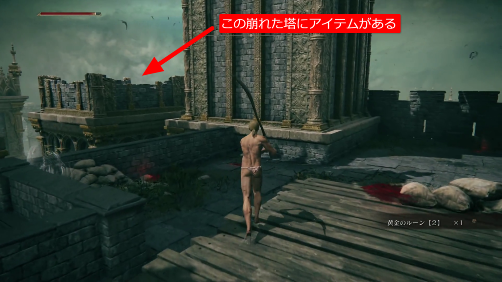 画像の正面の塔の縁を通って崩れた塔の近くまで行ってください。