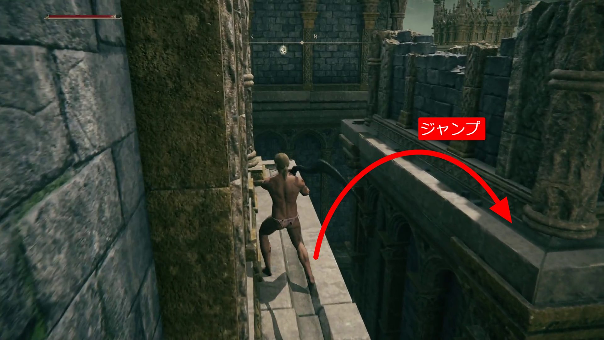 ここを左奥に進み、端から壁の縁に飛び乗り、更に進み続けると城の地下へ行けるようになります。