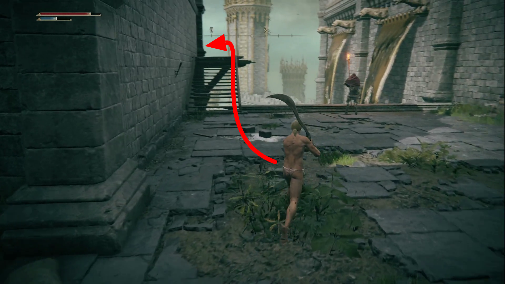 まず、ストームヴィル城の正門から少し進んだ(爆弾付きの矢を飛ばすバリスタ兵よりは手前)を西に行き(大量の敵兵や強力な獣がいるので注意)、3体の巨像の先のワープ装置を使い「リムグレイブの神授塔」に入ります。