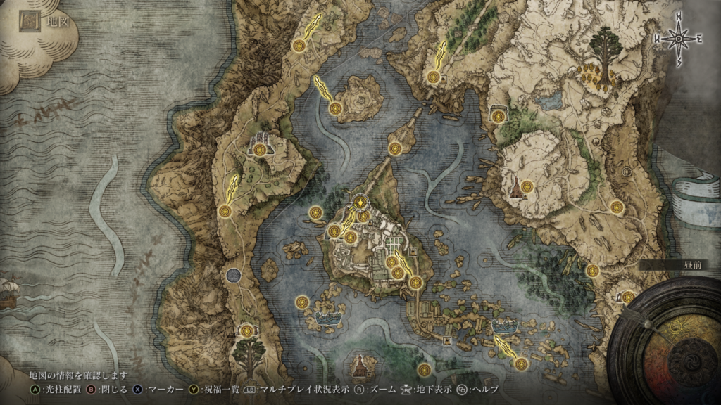 | ★月輪の弩 | 上記アイテムから2段飛び降りたあと西(W)方向へジャンプし、南(S)方面に進んだ先の建物のハシゴを登ってすぐ。宝箱の中。詳細は探索動画part4の5:14辺りからご覧ください。 |