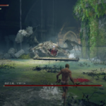 しっかり距離を取って最後の飛び込みを避けてから反撃しよう。 - 姿勢を低くしながら近づいて来て右から横斬り→飛び上がって叩きつけ