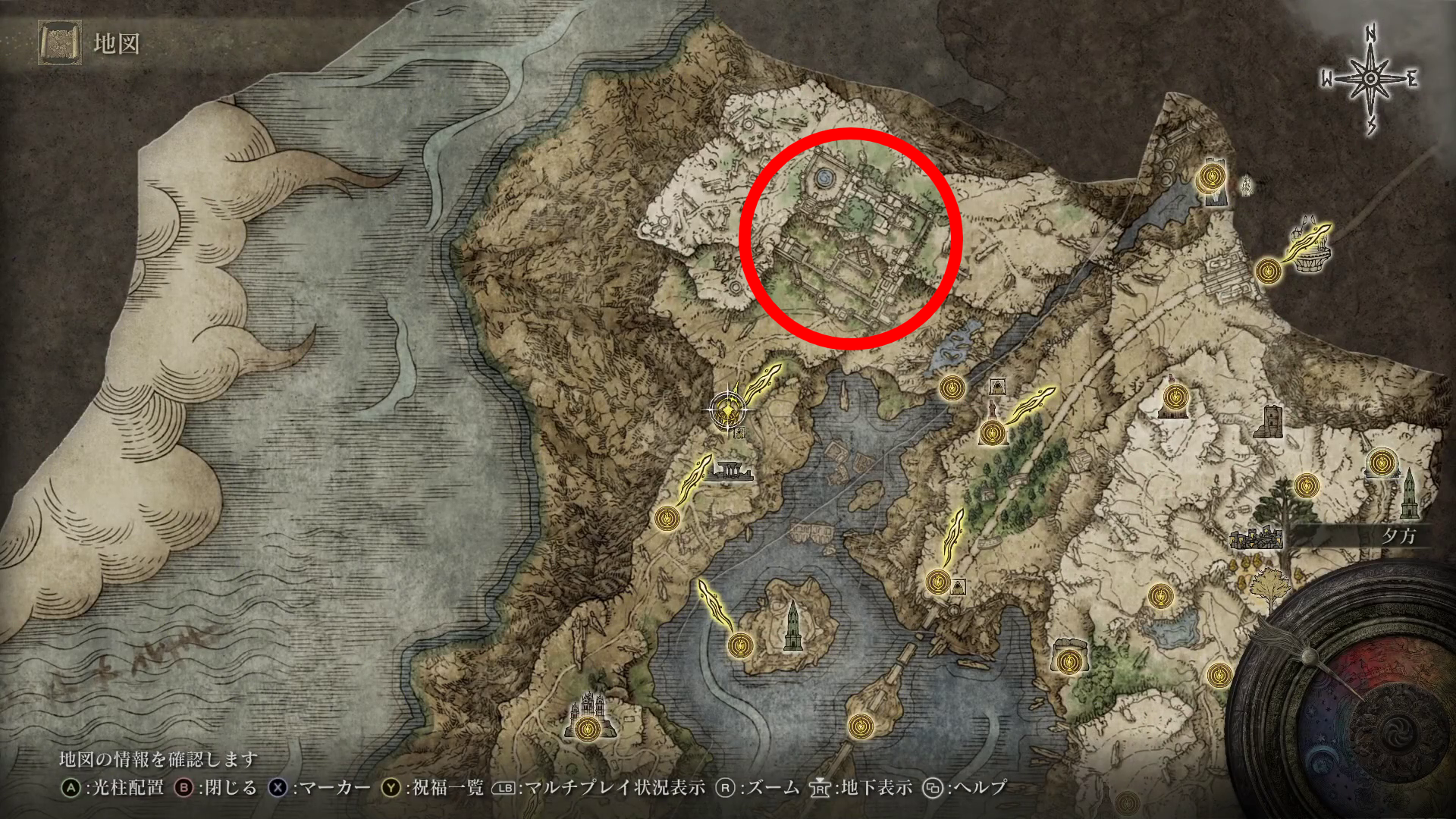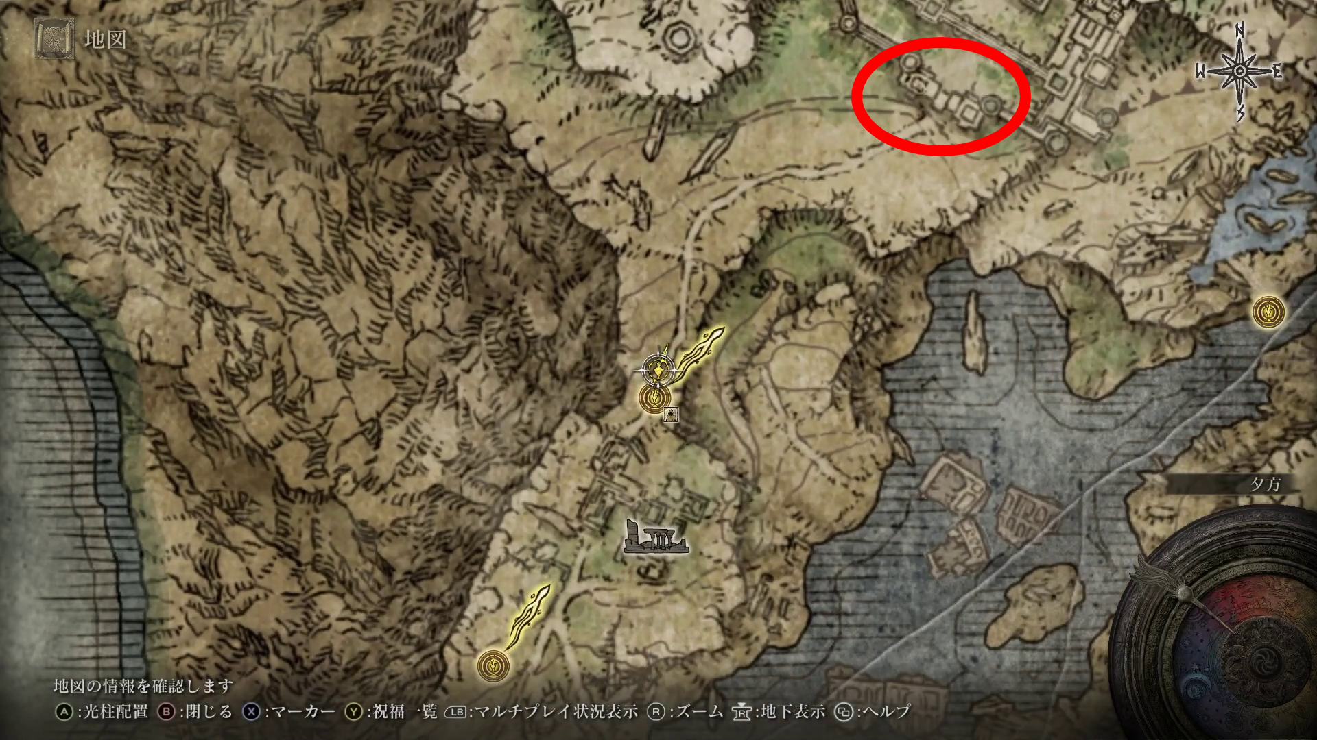 | ルーンの弧 | 祝福「城館下層」から外に出て城壁を左に進んだ一番奥の塔の裏。 |