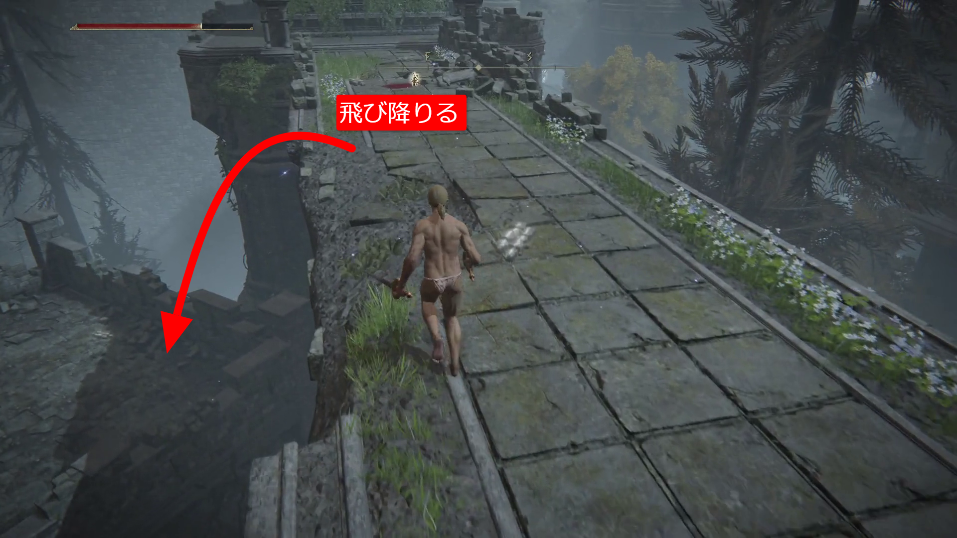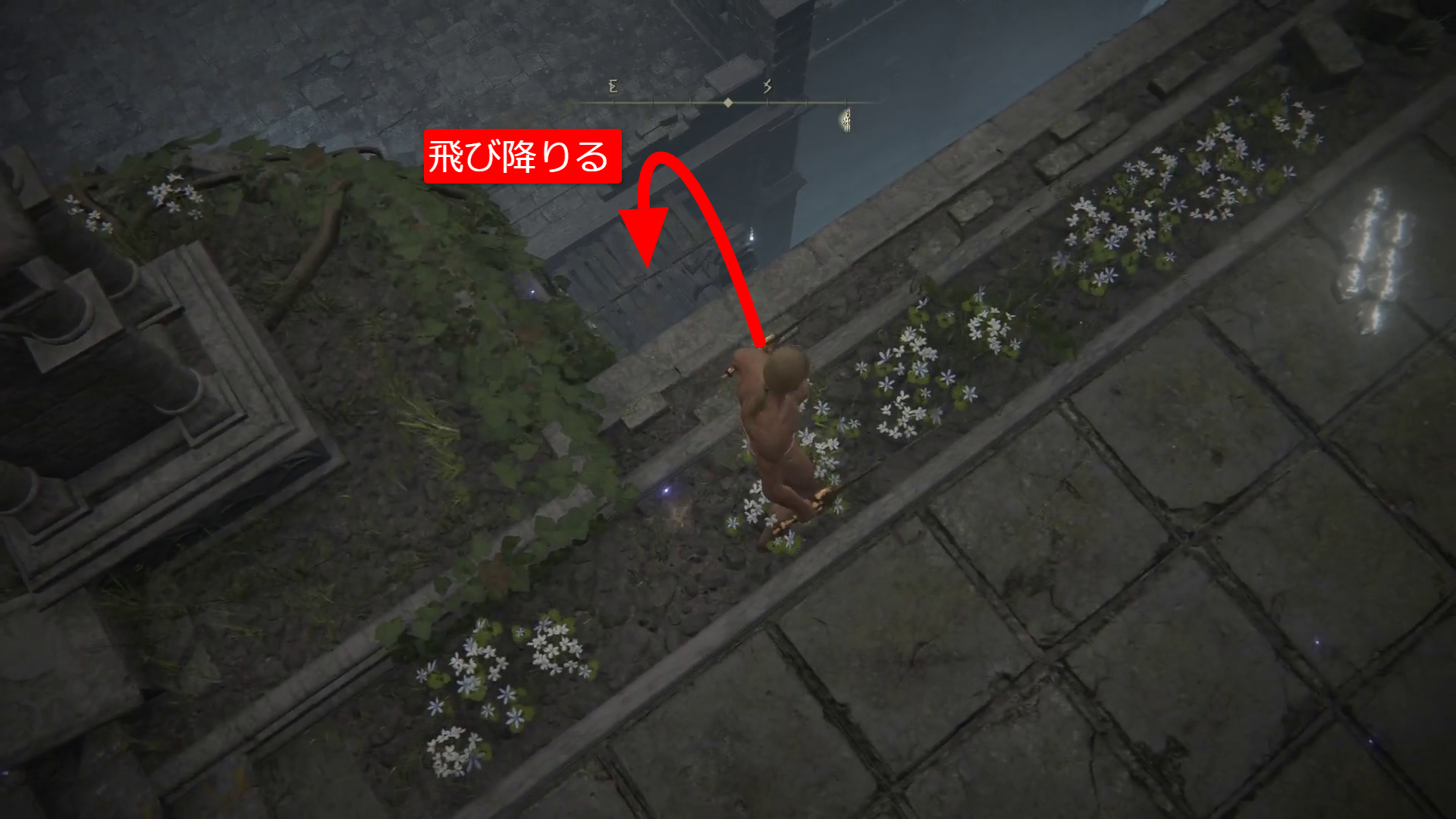 祝福「城館下層」の先の城壁の上を進むエリアでは飛び降りられる場所が2か所あります。