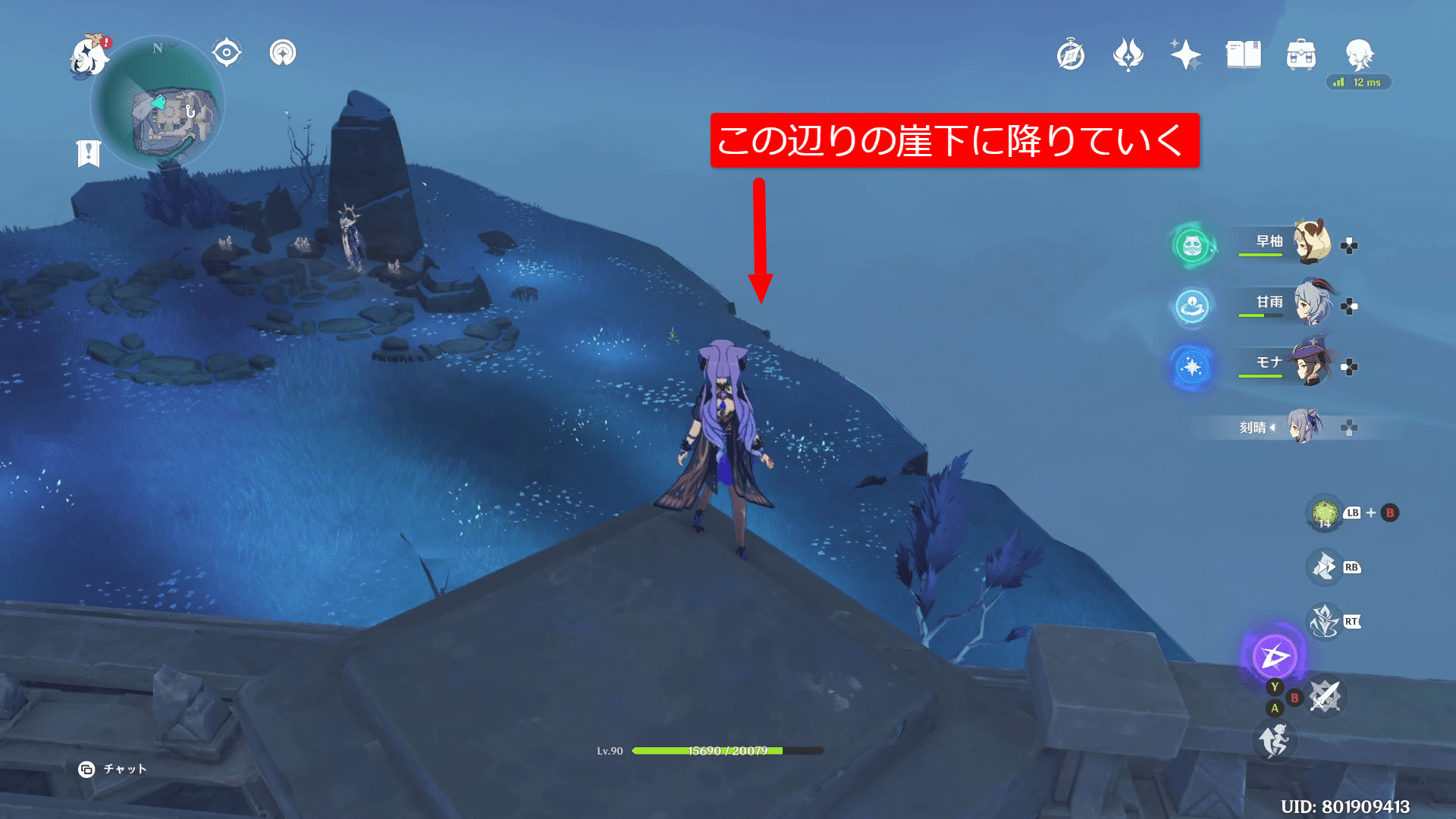 MAPでは高さが分かりませんが目的地は上ではなく下にあるので、ワープポイントから北東の崖から飛び降ります。