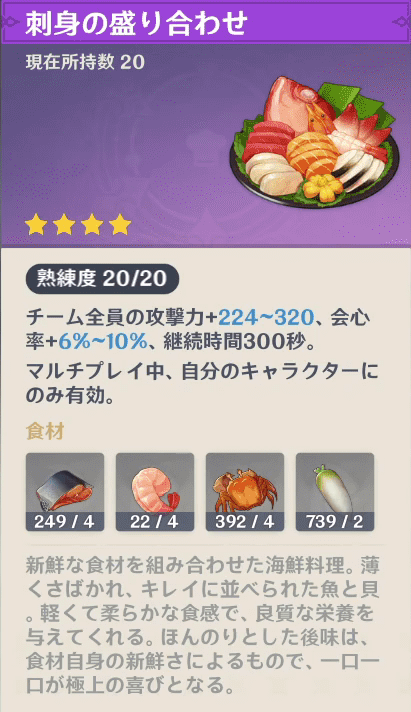 ここでは8万モラと刺身の盛り合わせと交換となります。