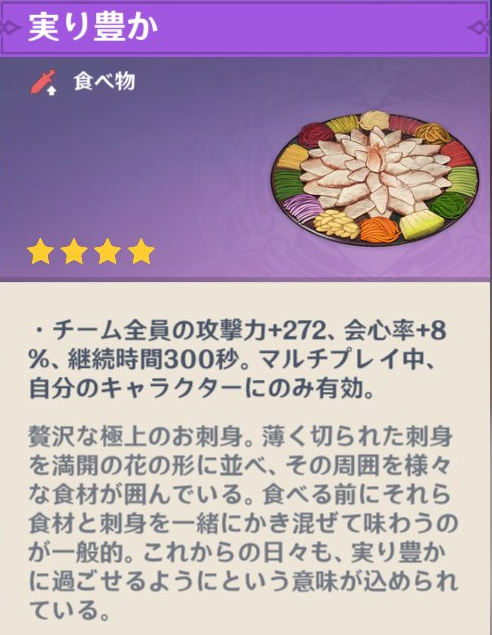 条件は8万モラと「実り豊か」という料理です。
