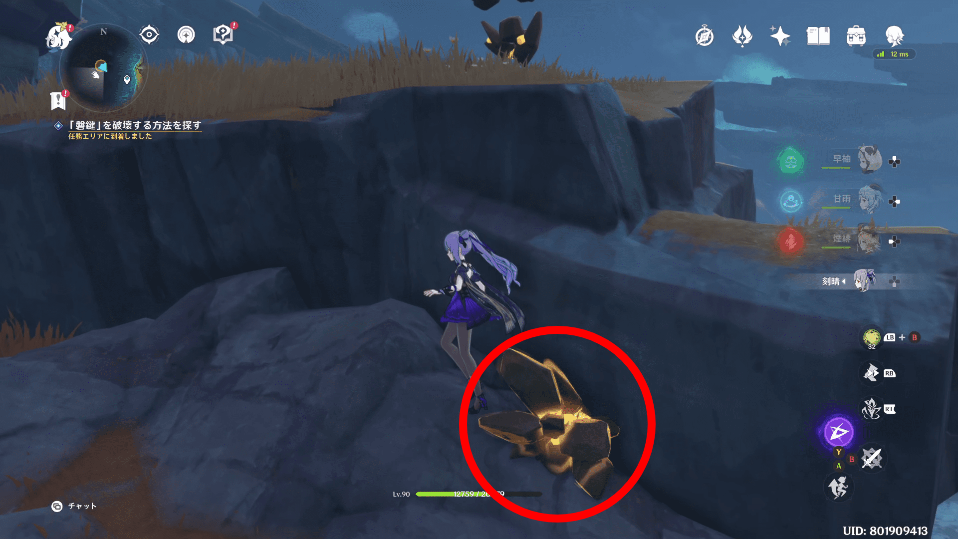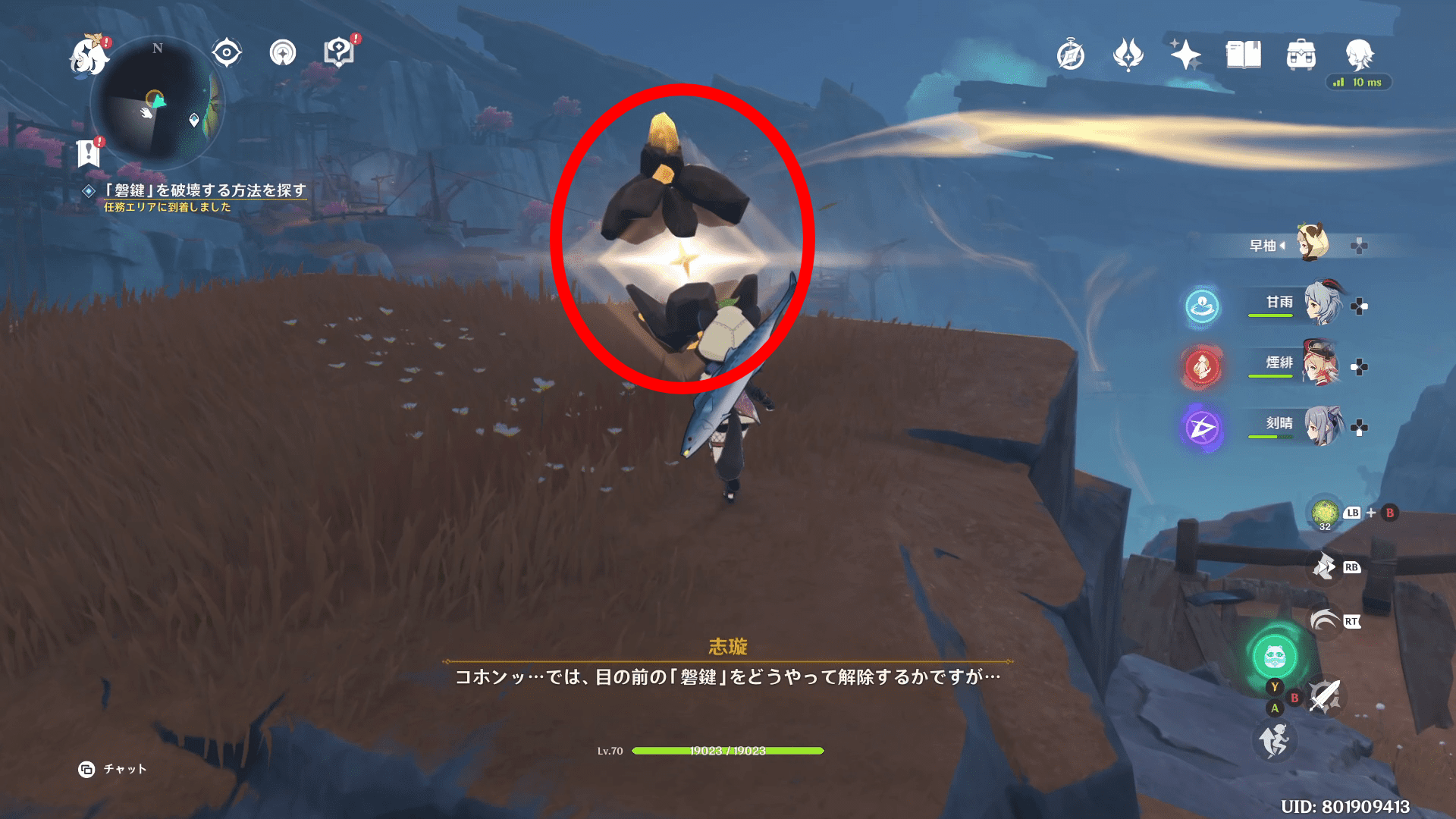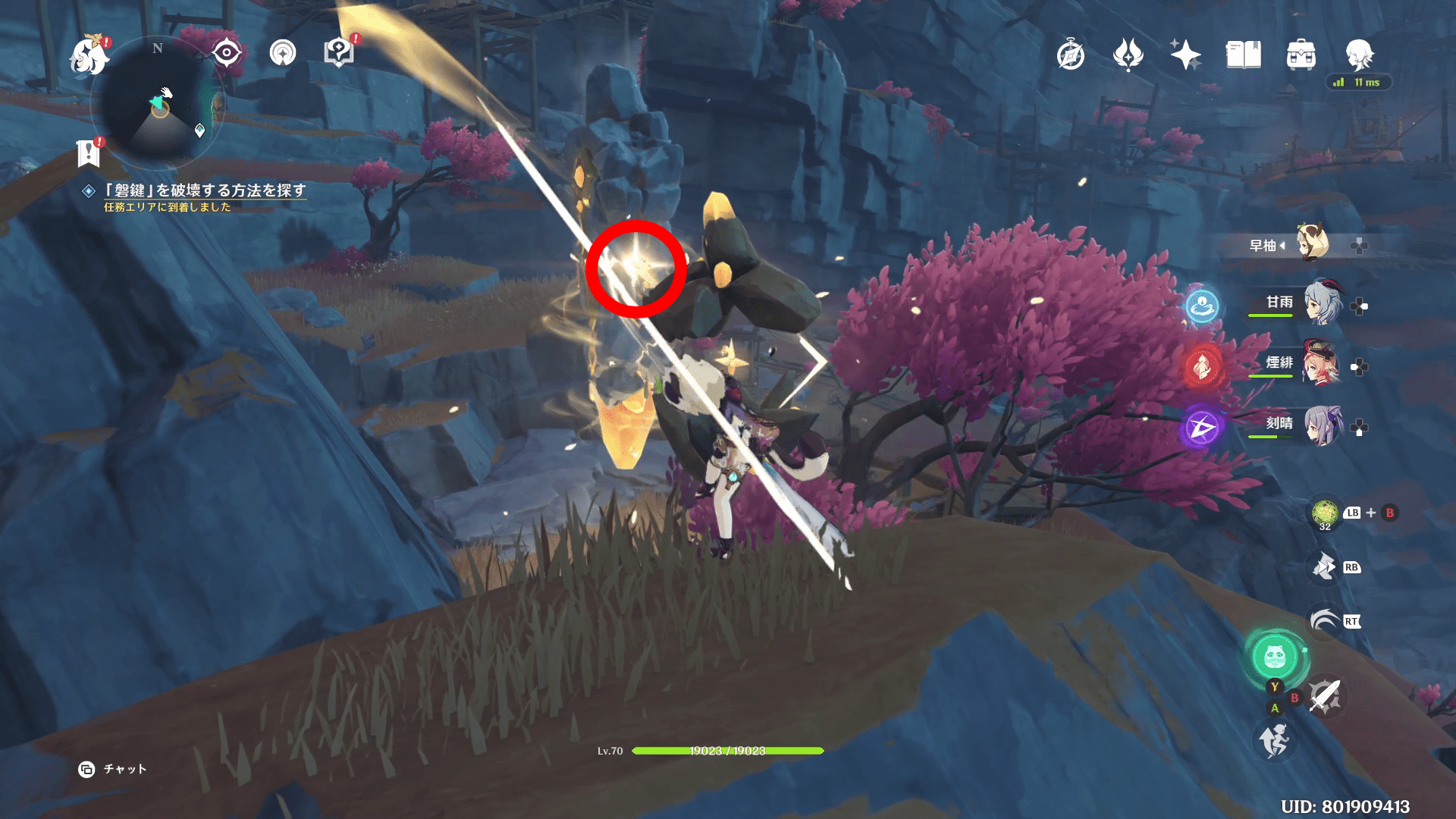 クエストを開始するとチュートリアル的に近くの磐鍵を壊すことになります。