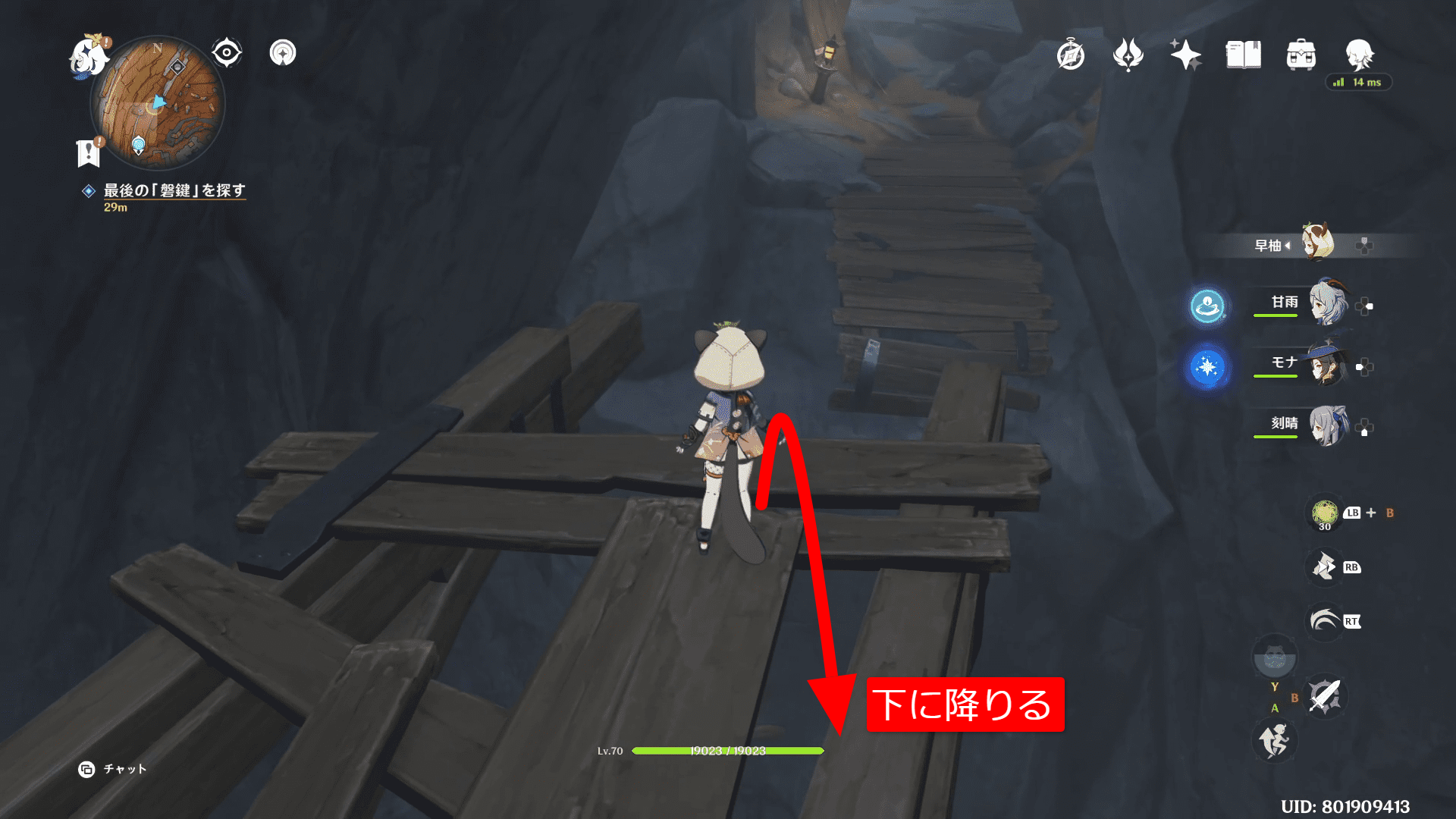 最後の磐鍵は、上で紹介した通りに磐鍵を回っていたなら1つ目(チュートリアル除く)の磐鍵の近くです。