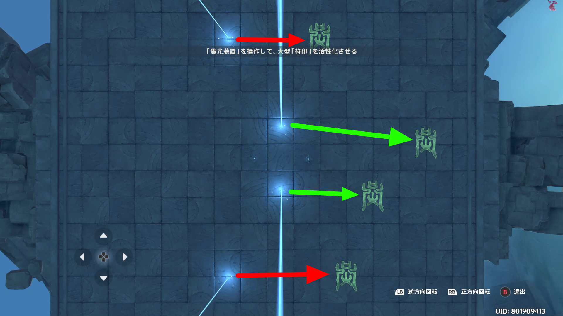 床の「符印」を踏んで敵を倒すと、続いて光の台座を動かすパートになります。