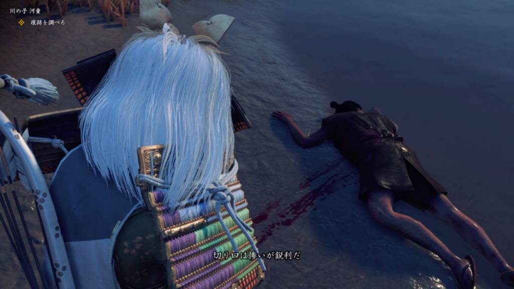▲河童のものと思われる足跡が残っていたのでその後を追っていくと、父親の骸がありました。ん?足跡は河童ではなく父親のものだったのか。父親の腹のあたりが傷ついており、境井仁検死官の検死によると太刀によって斬られた傷だということです。なんじゃい結局人間かい。人間とはげに恐ろしいものよ。