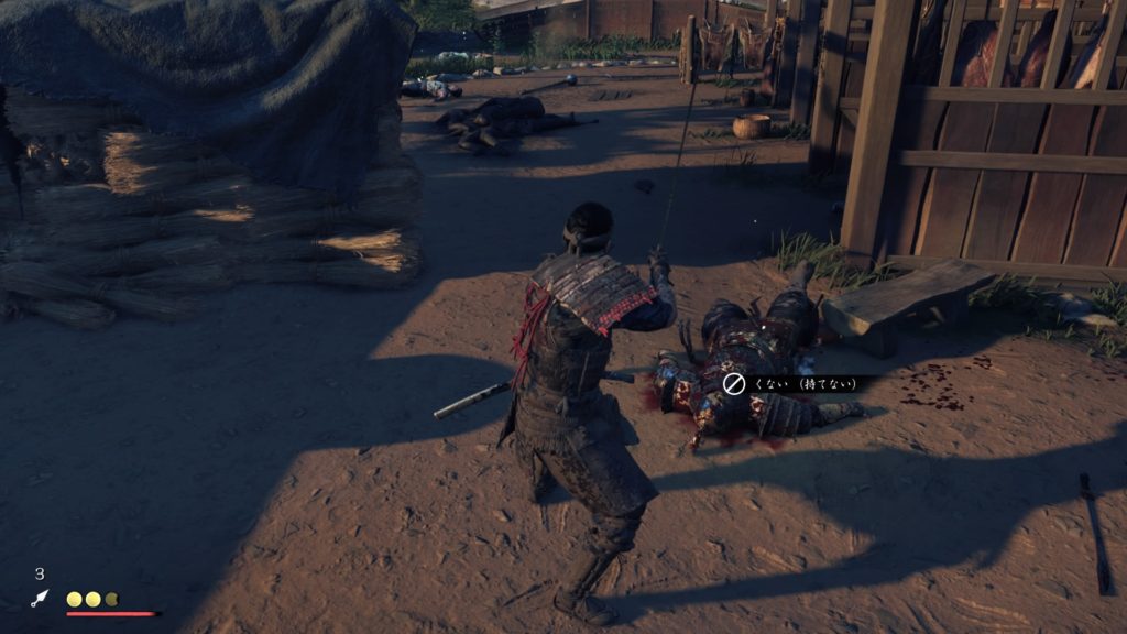 ▲正面右側の母屋は入り口に蒙古兵が1人だけしか居ないことを確かめてステルス攻撃。建物の中の人数まで索敵できなかったのですが、結局中に蒙古軍はおらず物資を回収します。母屋の中に1人対馬島民が生き残っており逃がしてあげることに成功。よかったよかった。その後床下に抜けられる穴を見つけてとりあえず入りましたが敵を見つけられることもなく、物資もなく無意味に軒下をはい回るのでした。