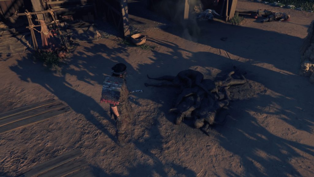 ▲母屋の2階には対馬島民の遺体が5体ほど放置されていました。宿に泊まっていた人と、武士。蒙古軍許すまじ。窓から1階の屋根に移動し上から蒙古軍を索敵します。