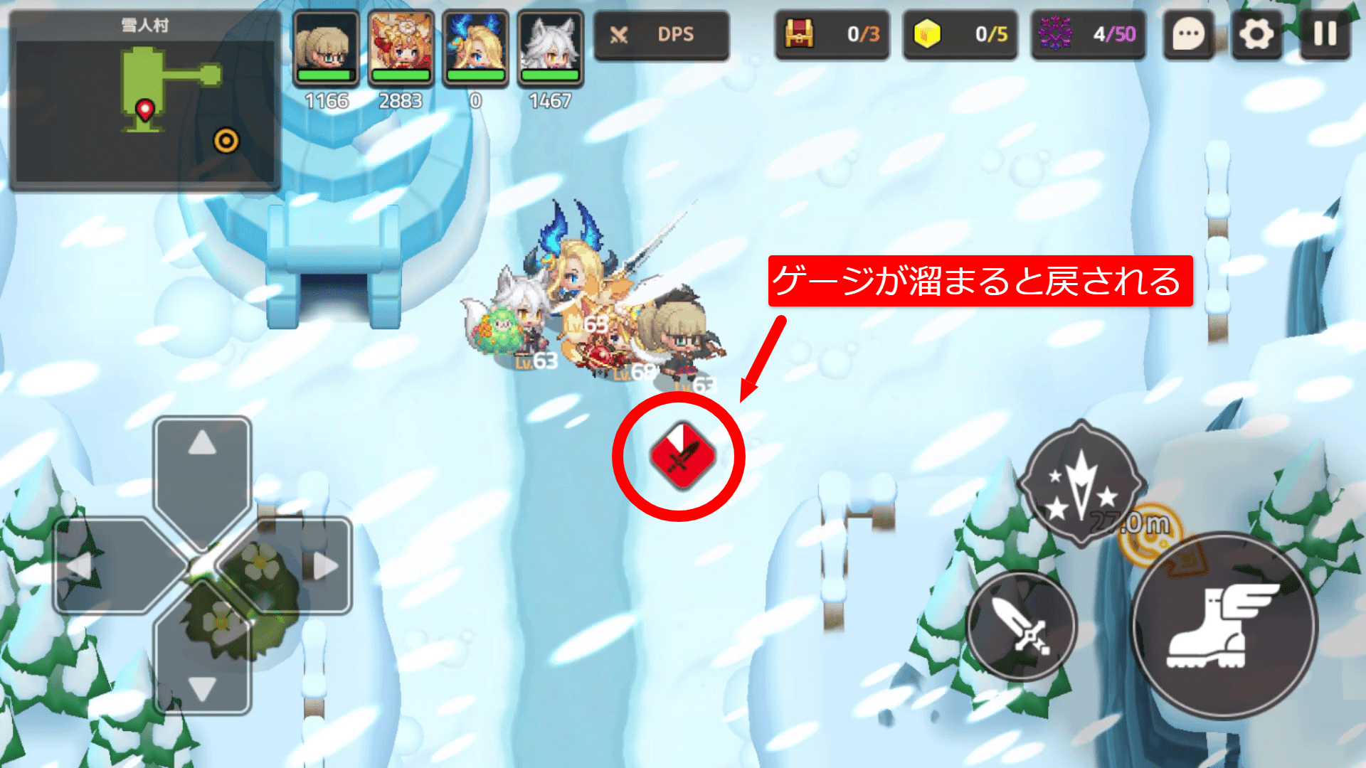 ステージ開始後のふたフロアのみ吹雪となっていて、立っているだけでゲージが溜まっていき、開始地点に戻されてしまいます。