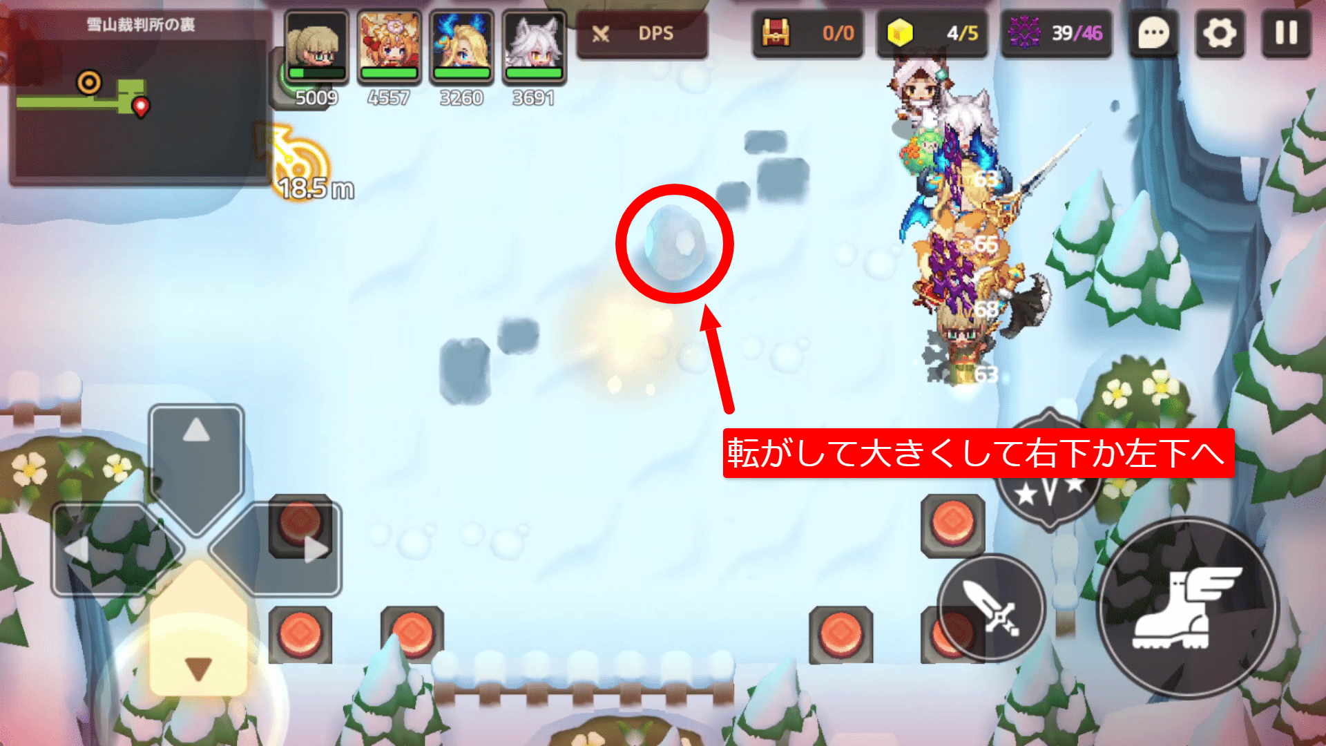 爆弾が置いてあるのでそれで岩を破壊したあと、まずは下の中央にある雪玉を転がして右下か左下のスイッチを押してください。