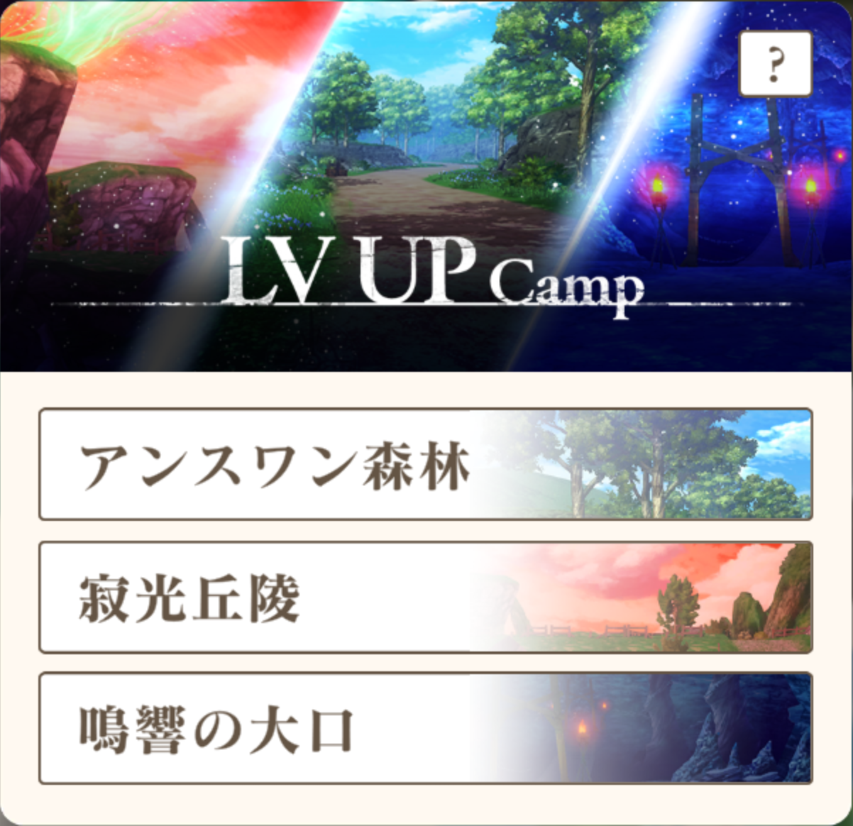 レベルアップキャンプでは3つのエリアから1つを選択。