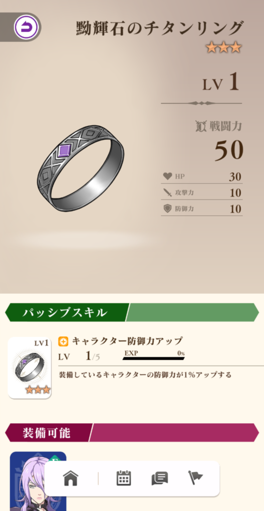 - 効果:装備しているキャラクターの攻撃力が1%アップする